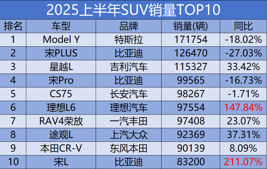 上半年SUV銷量TOP10:僅三款破十萬,燃油車占五席?