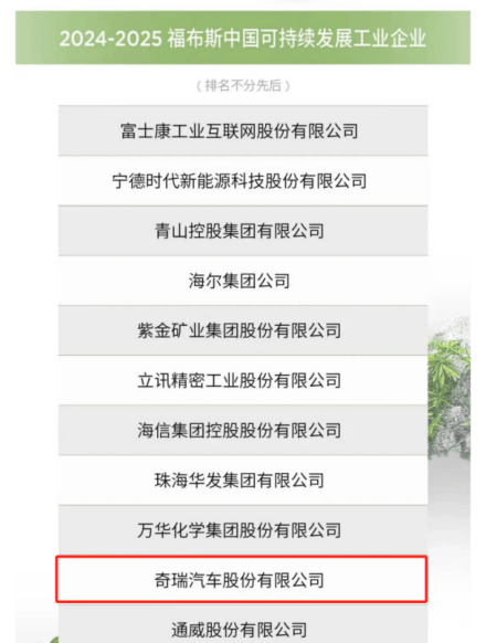 圖為奇瑞登榜2024-2025福布斯中國可持續(xù)發(fā)展工業(yè)企業(yè)榜