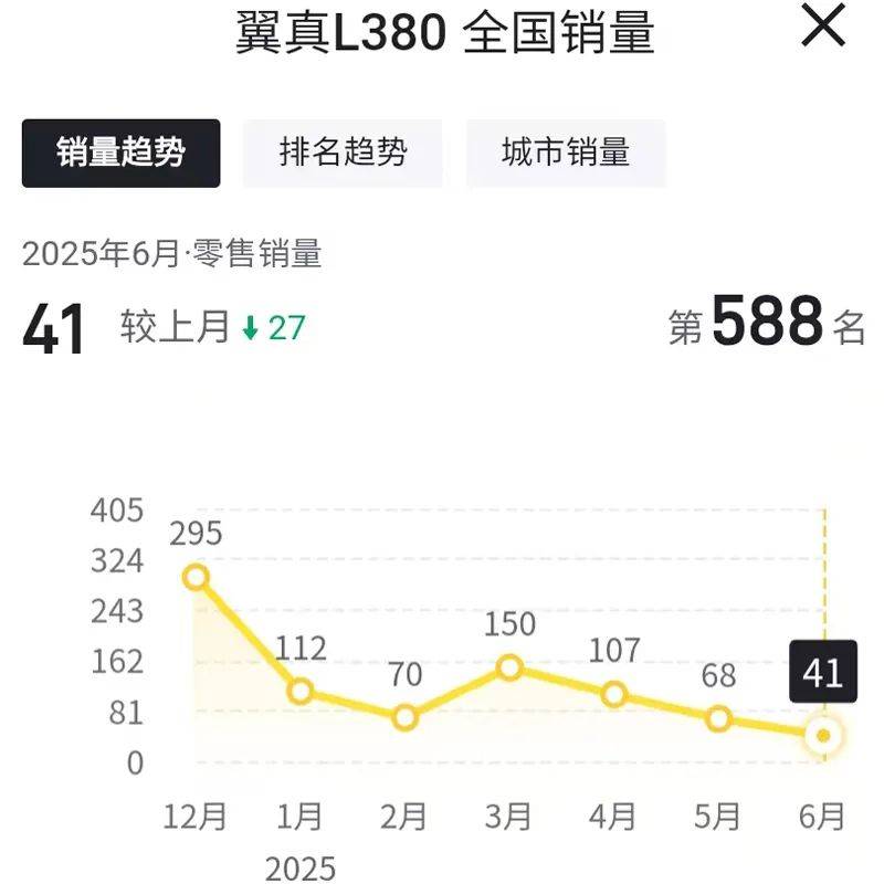 比如,今年6月份,翼真L380的銷量為41輛,相比今年5月份的銷量68輛,環比下滑39.7%,連續3個月呈現下滑趨勢。同時,今年1-6月份,翼真L380的累計銷量也只有548輛,半年的累計銷量不足600輛。