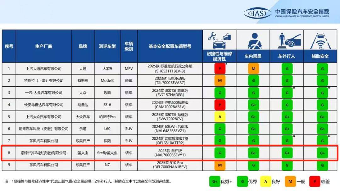 這對于小車而言挑戰加倍,在中保研最新公布的一批汽車安全指數測評結果中, firefly 螢火蟲卻交出一份令人滿意的答卷:耐撞性與維修經濟性指數 G、車內乘員安全指數 G+、車外行人安全指數 G+、車輛輔助安全系統 G + 的全優成績,成為中保研史上首臺在碰撞安全方面獲得 G + 評級的小車。