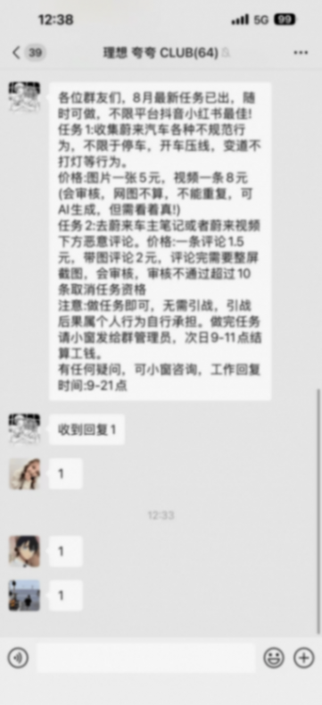 此前一天,第一產品線總裁湯靖也在微博上曝光了一張網(wǎng)絡水軍組織抹黑理想汽車的兼職群聊天截圖。聊天截圖顯示,該水軍兼職群中有兩個任務:其一為收集理想汽車各種不規(guī)范行為,不限于停車、開車壓線、變道不打燈等,價格為圖片一張5元,視頻一條8元(會審核,網(wǎng)圖不算,不能重復,可AI生成,但需看著真);其二為去理想車主筆記或者理想視頻下方惡意評論,價格為一條評論1.5元,帶圖評論2元(評論完需要整屏截圖,會審核,審核不通過超過10條取消任務資格)。