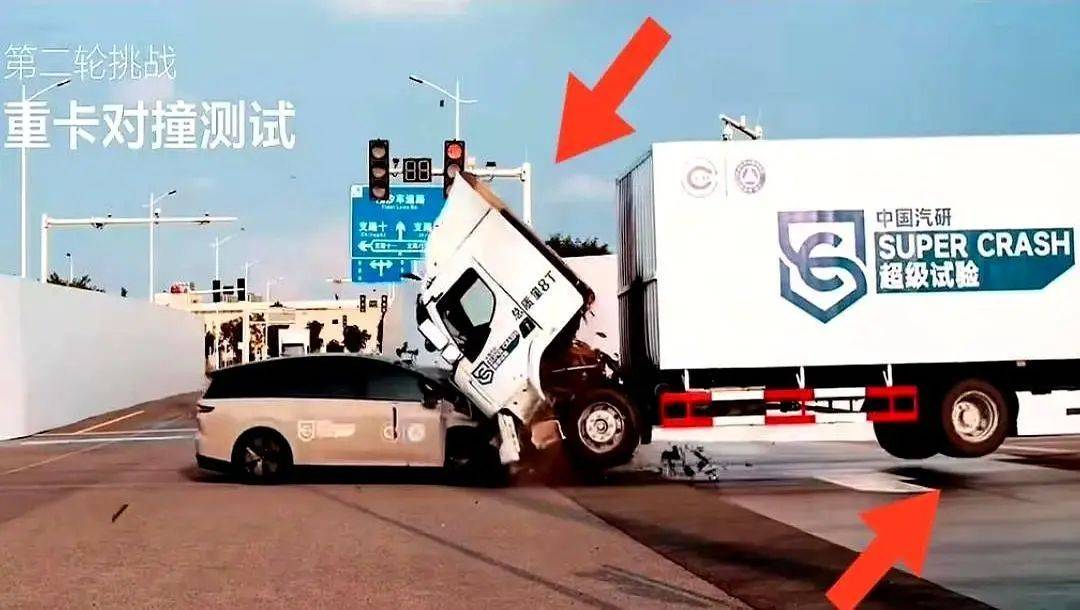 測試中,理想i8與一輛重型卡車發(fā)生正面碰撞。卡車的駕駛室與貨箱分離,車輪騰空,而i8的車身幾乎完好無損。