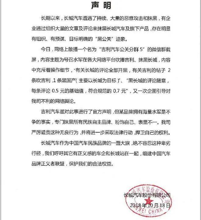 但長城也表示,“為維護品牌商譽和企業(yè)的正常運營,已經向警方報案并向屬地網(wǎng)信管理部門實名舉報,申請調查并處理‘黑公關’行為,運用法律武器維護自身權益。”
