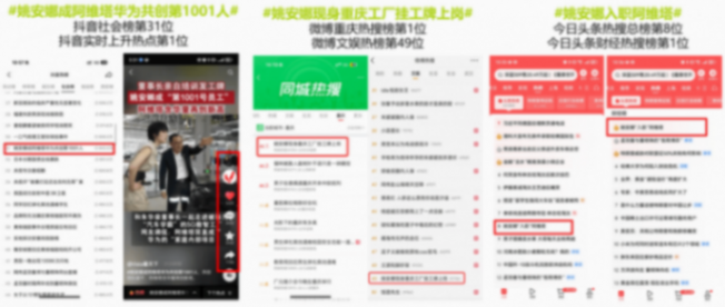 2. 渠道聯(lián)動,引爆全網(wǎng)聲量:整合官方渠道、高管賬號、公關(guān)媒體、KOL/KOC及員工資源進(jìn)行立體化傳播,成功打造#走近用戶共創(chuàng)熱愛 #有種熱愛很阿維塔 #品牌體驗(yàn)官姚安娜的一天 #姚安娜成阿維塔華為共創(chuàng)第1001人 #姚安娜現(xiàn)身重慶工廠掛工牌上崗 等話題,實(shí)現(xiàn)全平臺累計(jì)曝光超1.3億,互動量超58萬,并強(qiáng)勢登陸抖音、微博、今日頭條等平臺共計(jì)6個(gè)熱搜榜單。