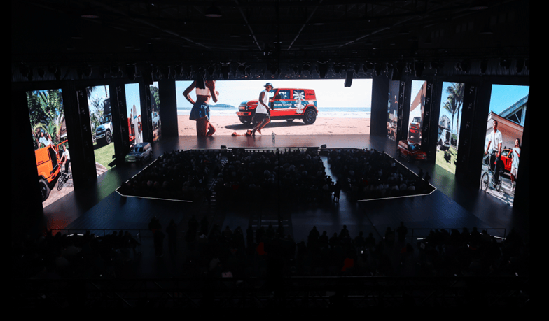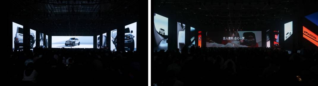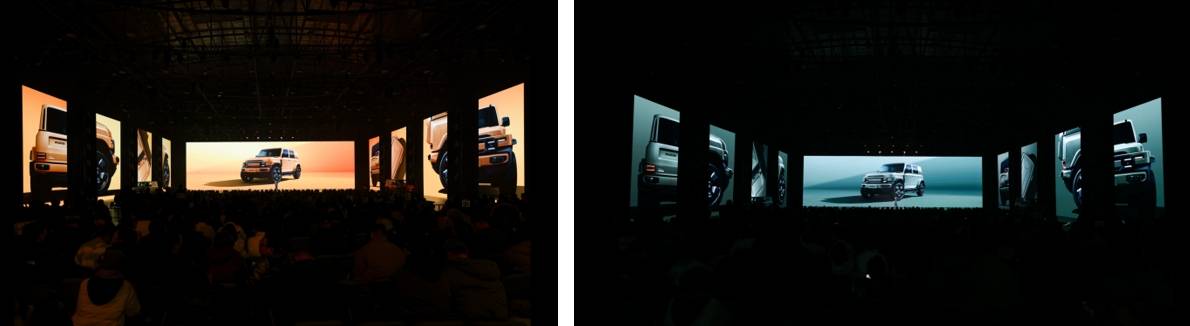 內(nèi)場:V23產(chǎn)品的沉浸視覺盛宴—發(fā)布會內(nèi)場多屏運(yùn)用+環(huán)繞式出車舞臺,主副屏的搭配與聯(lián)動便于產(chǎn)品全景+細(xì)節(jié)的全面展示。
