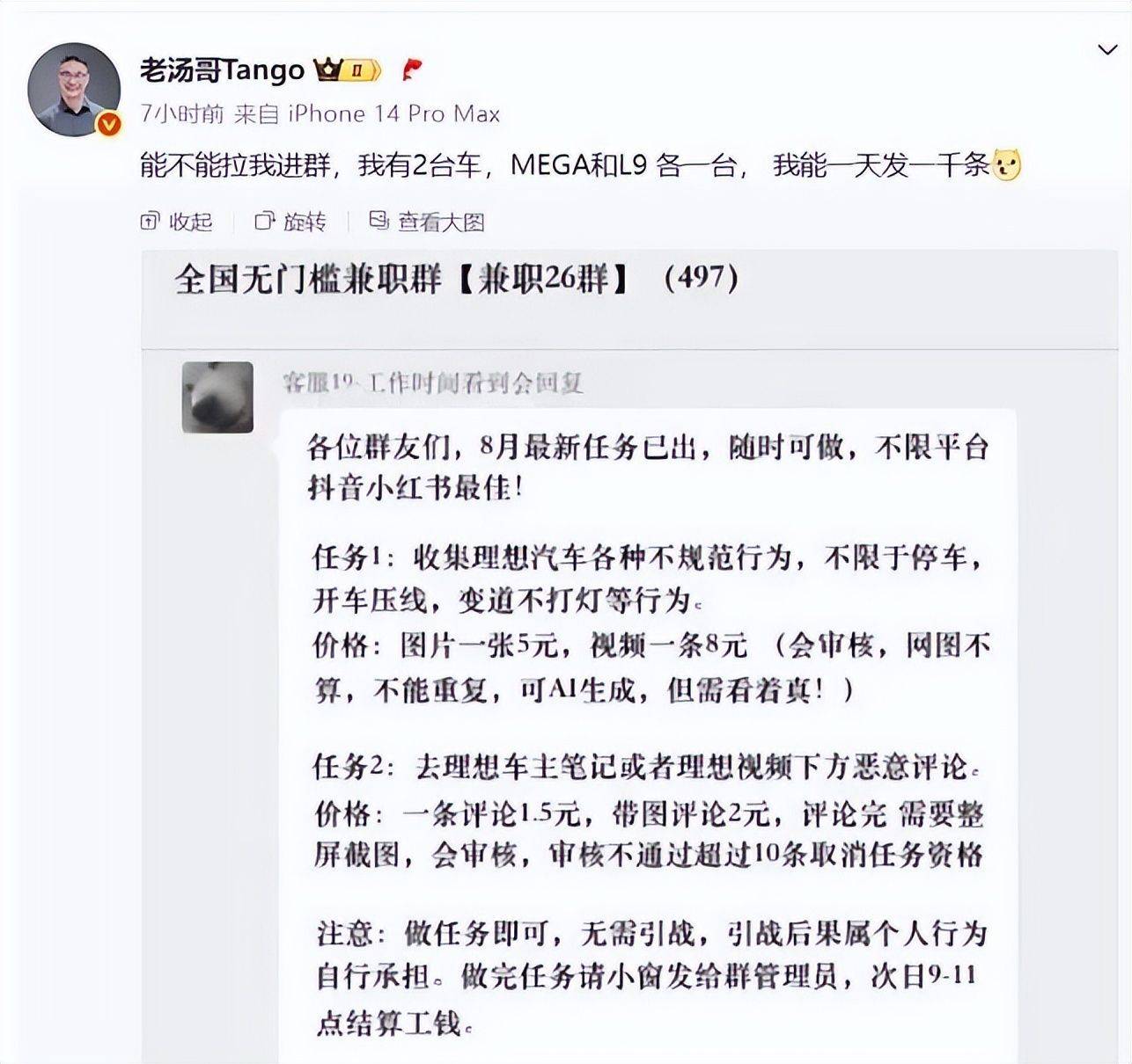 怒極而笑的理想汽車產(chǎn)品負(fù)責(zé)人湯靖曬出一張網(wǎng)絡(luò)水軍組織抹黑理想汽車的兼職群聊天截圖,并調(diào)侃稱,“能不能拉我進(jìn)群,我有2臺(tái)車,和L9各一臺(tái),我能一天發(fā)一千條。”