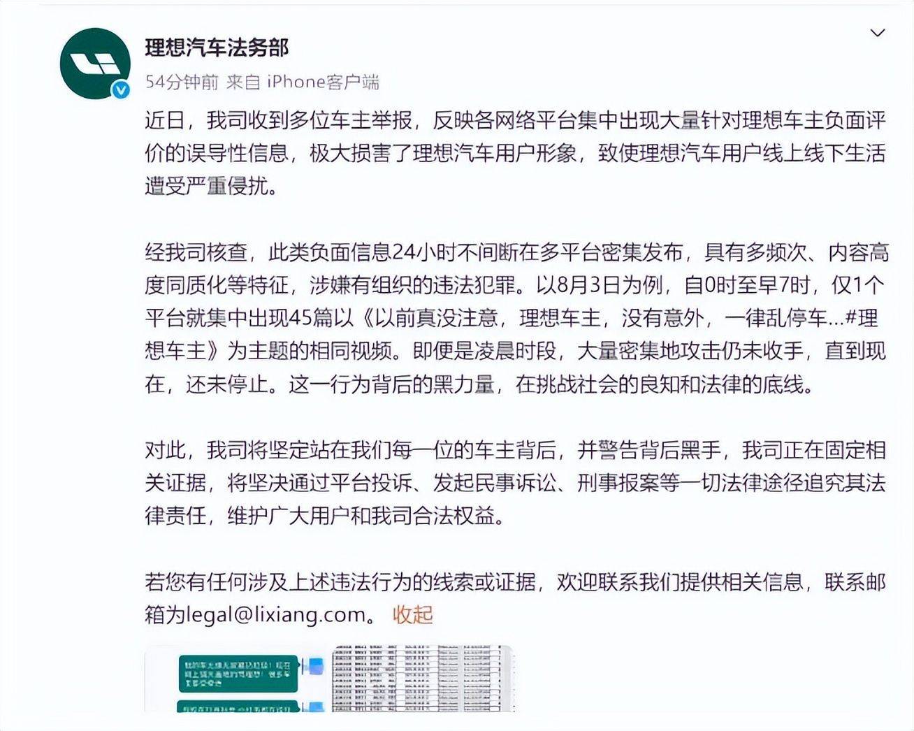 8月7日,理想汽車法務(wù)部發(fā)布聲明稱,經(jīng)核查,此類負(fù)面信息24小時(shí)不間斷在多平臺(tái)密集發(fā)布,具有多頻次、內(nèi)容高度同質(zhì)化等特征,涉嫌有組織的違法犯罪。