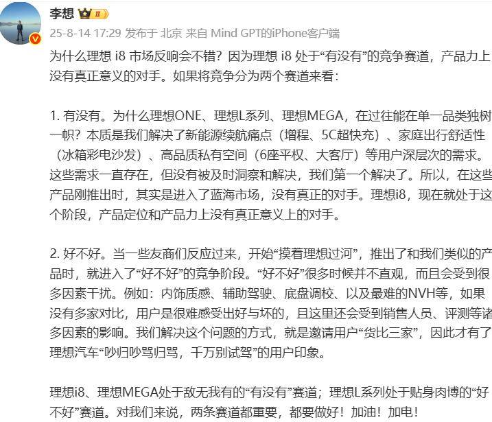 8月14日傍晚,理想汽車CEO李想在其微博拋出一套"競爭雙賽道"理論,迅速引爆行業(yè)熱議。李想豪言,"為什么理想i8市場反響不錯?因為它在'有沒有'的賽道里, 產(chǎn)品力上沒有真正的對手",李想將市場競爭切割為兩個維度——"敵無我有"的"有沒有"賽道,與貼身肉搏的"好不好"賽道。這番將自家產(chǎn)品歸為"無競品"的論斷,讓網(wǎng)友覺得曾經(jīng)的李想又回來了!