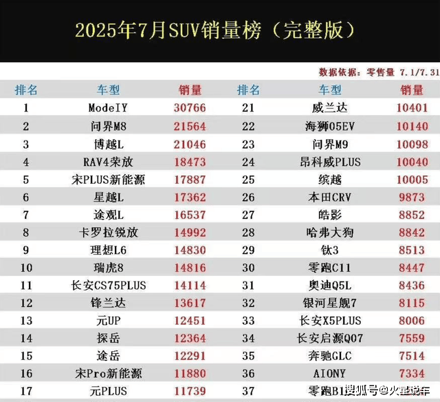 7月SUV銷量榜出爐:特斯拉Model Y排第一,奇瑞瑞虎8進(jìn)前十