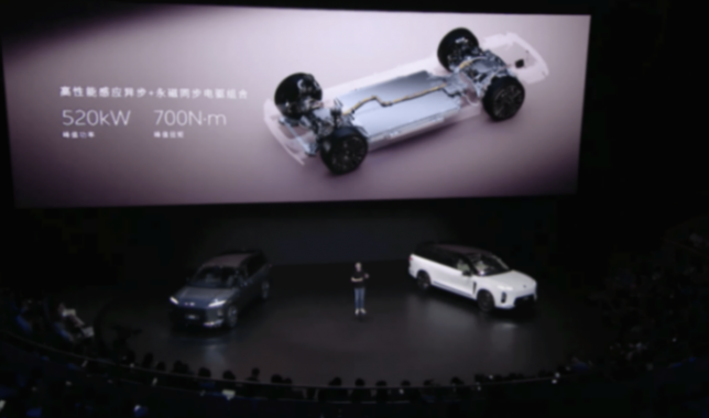 動力上,新車搭載了與蔚來ET9同款的雙電機四驅系統,前軸為180kW感應異步電機,后軸為340kW永磁同步電機,綜合功率高達520kW,扭矩達到700N?m。