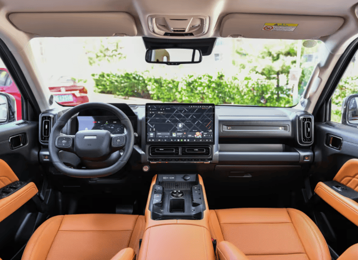 2026 款哈弗猛龍 Hi4 在外觀上可謂煥然一新。前臉采用了極具特色的 “榫卯方燈” 設(shè)計,靈感源自傳統(tǒng)建筑工藝,直角方正的燈組與整車硬朗風(fēng)格相得益彰,不僅強化了硬派氣息,單側(cè) 123 顆高透 LED 燈珠,更讓其遠(yuǎn)光照射最遠(yuǎn)可達(dá) 189 米,近光最遠(yuǎn) 108 米,夜間駕駛與復(fù)雜路況下的照明效果堪稱一流。車尾的 “斗拱晶界尾燈” 同樣吸睛,300 顆 628nm 紅光 LED 以菱形點陣排列,通過高標(biāo)準(zhǔn) PWM 控制技術(shù),實現(xiàn)了均勻且層次感豐富的光學(xué)效果,杜絕了尾燈色差問題,辨識度極高。車身側(cè)面新增的 “磐石巖盾輪眉” 向外擴展 3 厘米,既強化了越野風(fēng)格,又能有效阻擋沙石飛濺,保護車身。再加上全新的 “薄荷綠” 車漆,融入納米顏料,抗氧化能力強,漆面還有輕微自我修復(fù)功能,細(xì)節(jié)之處盡顯用心。