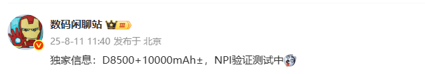 下一代中端機(jī)電池肯定普遍都要突破8000毫安,可手機(jī)廠商在這一塊的發(fā)展速度又會(huì)突破用戶預(yù)期,因?yàn)?萬毫安電池手機(jī)也很快就要來,據(jù)最新爆料顯示,目前已經(jīng)有手機(jī)廠商正在測試天璣8500芯片+1萬毫安電池的組合,這是一個(gè)很明顯的中端機(jī)組合,而且既然已經(jīng)到了NPI驗(yàn)證階段,證明距實(shí)際試生產(chǎn)已經(jīng)不遠(yuǎn)了,如果測試進(jìn)展順利,加上用戶又有很高期待,相關(guān)機(jī)型提前發(fā)可能性是很大的。