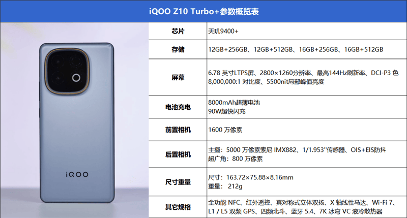 iQOO Z10 Turbo Pro+作為Z系列的性能王炸選手,內(nèi)置了比iQOO Neo10 Pro還要強(qiáng)的聯(lián)發(fā)科天璣9400+平臺(tái),標(biāo)配了LPDDR5X Ultra 9600Mbps內(nèi)存以及UFS 4.1滿級(jí)存儲(chǔ),在性能搭配上絕不含糊。