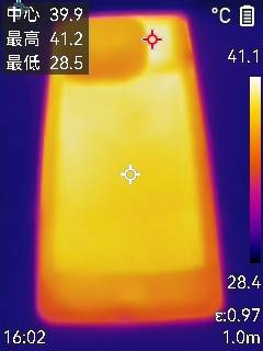 游戲過(guò)后,機(jī)身背面最高溫度41.2攝氏度,高溫區(qū)域位于攝像Deco的右側(cè)位置。