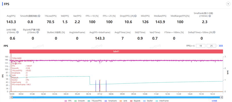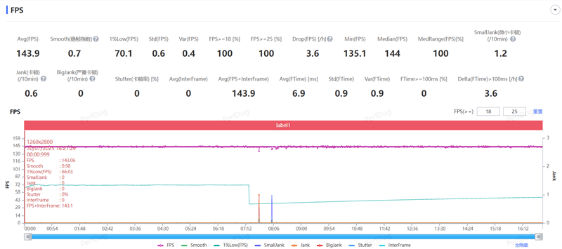 經(jīng)過(guò)一局激烈的對(duì)戰(zhàn)測(cè)試,游戲的幀率全程穩(wěn)定在了144FPS水平線上,平均幀率143.3FPS,平均波動(dòng)0.8,游戲期間偶爾會(huì)出現(xiàn)微小波動(dòng),但在游戲過(guò)程中完全察覺不到卡頓。