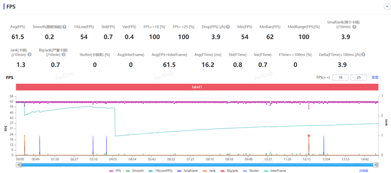 接著我們測(cè)試了《原神》手游,在最高畫質(zhì)+最高幀率下關(guān)閉動(dòng)態(tài)模糊,進(jìn)行15分鐘的楓丹跑圖測(cè)試,游戲幀率全程穩(wěn)定在60FPS水平線上,平均幀率61.5FPS,平均波動(dòng)僅有0.2。