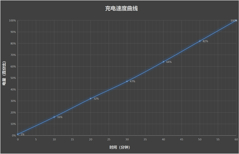 我們從1%開始進(jìn)行滅屏充電測(cè)試,10分鐘手機(jī)電量充至16%,20分鐘電量充至32%,半小時(shí)電量達(dá)到47%,充入接近一半的電量,最終完全充滿電用時(shí)整整60分鐘。