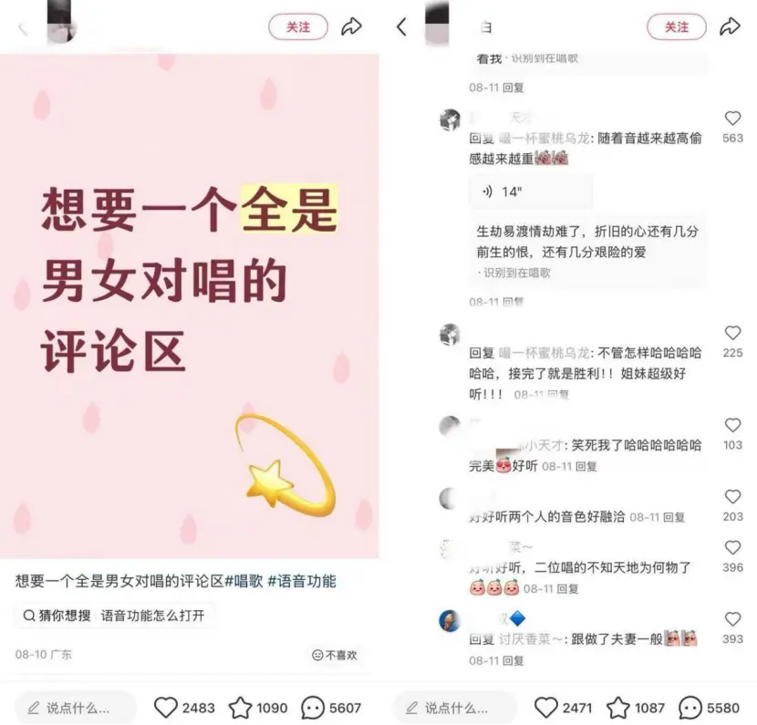 最近點開小紅書,經(jīng)常出現(xiàn)一些點贊只有十幾個,評論卻成百上千條的“點歌帖”。發(fā)帖人一句“進來唱兩句”,評論區(qū)擠滿了語音條,各種歌聲此起彼伏,宛如一個即時響應(yīng)的“互聯(lián)網(wǎng)電子K歌房”。