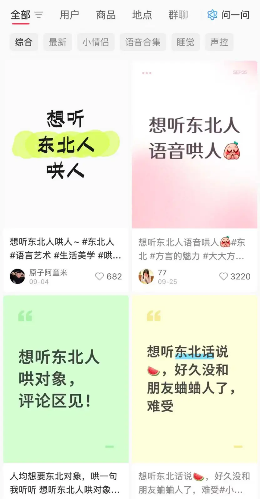 從一些細節(jié)也可以看出小紅書對這個“測試功能”的上心。比如平臺會自動識別語音,并用文字在語音旁邊打上標簽,比如識別出“唱歌”,或者不同音色如“甜嗓”“低音炮”“元氣音”。