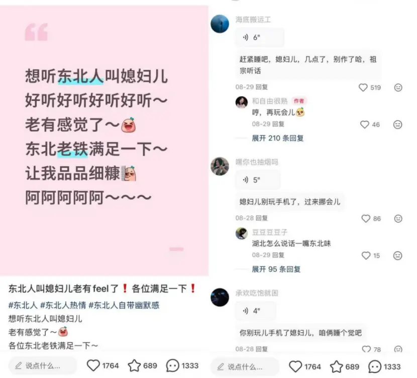 又有特色又一向樂得抽象的東北人都快被玩包漿了,一會兒排隊喊“媳婦兒”,一會兒喊麥、唱二人轉(zhuǎn),這邊喊東北人去哄人,那邊叫東北人去罵人,還有看熱鬧不嫌事兒大的想聽東北人念詩。