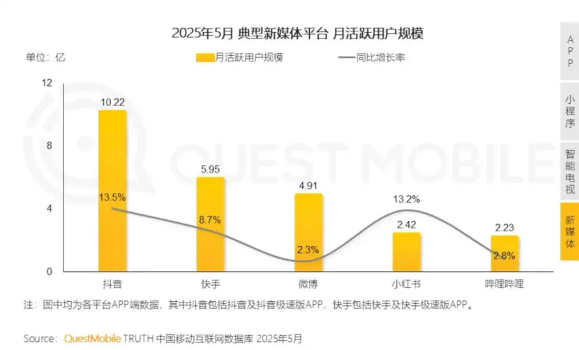 但是月活躍規(guī)模并不是第一梯隊。QuestMobile數(shù)據(jù)顯示,2025年5月,小紅書的月活躍用戶規(guī)模為2.42億,相比之下抖音為10.22億,快手為5.95億。
