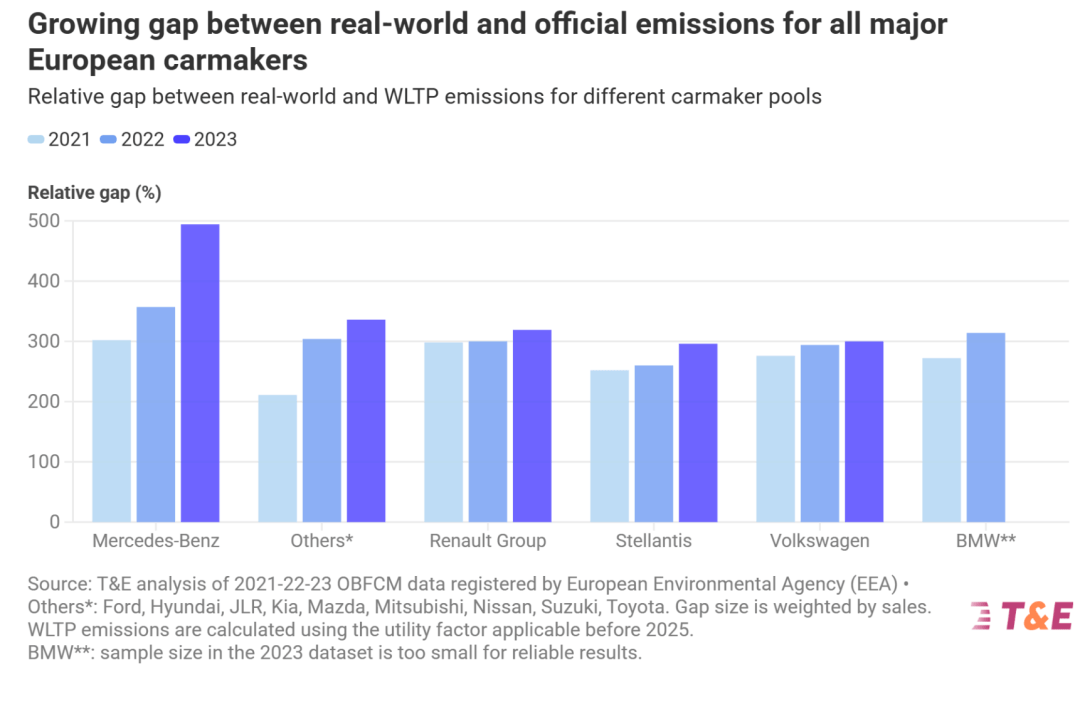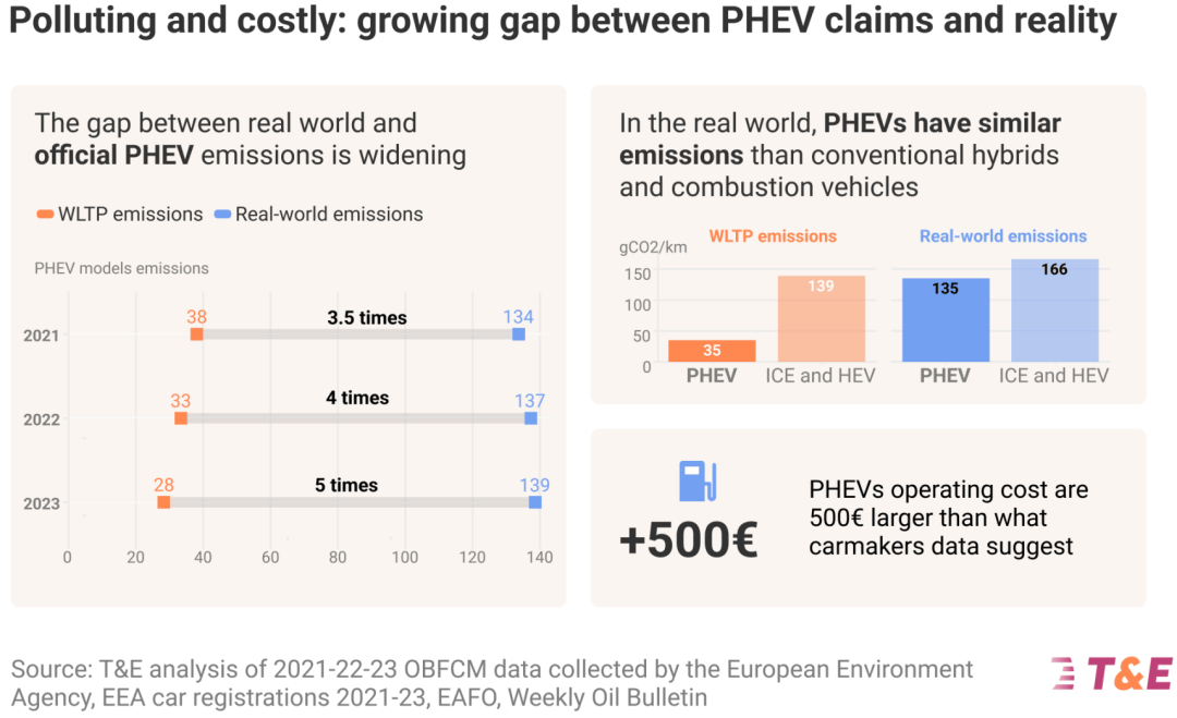 T&E調(diào)查了12.7萬輛歐洲PHEV車主的2023年真實(shí)用車數(shù)據(jù)——實(shí)際平均排放高達(dá)135克/公里,比官方數(shù)據(jù)高了近5倍!比例還在逐年提升的,2021年才3.5倍。