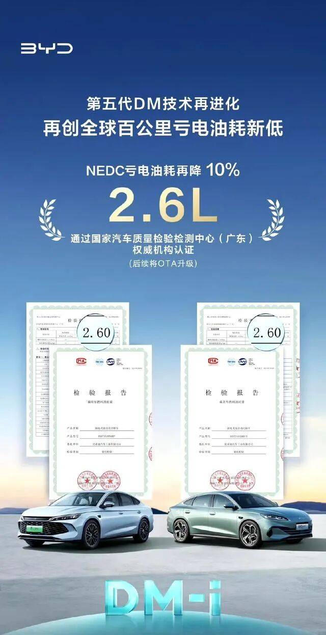 我們以的第五代DM-i為例,其官方百公里匱電油耗為2.6L/100km。