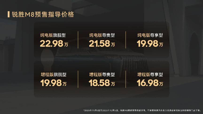 11月5日,北京汽車制造廠旗下銳勝汽車正式宣布全新大型MPV銳勝M(fèi)8開(kāi)啟預(yù)售,增程版預(yù)售價(jià)16.98萬(wàn)元起,純電版19.98萬(wàn)元起。新車以“越級(jí)空間、越級(jí)補(bǔ)能、越級(jí)續(xù)航、越級(jí)舒享”四大核心亮點(diǎn),精準(zhǔn)覆蓋商務(wù)接待、家庭出行、高端營(yíng)運(yùn)、戶外休旅四大核心場(chǎng)景,試圖打破傳統(tǒng)MPV的功能壁壘,為用戶提供“宜商宜家宜旅”的全能解決方案。