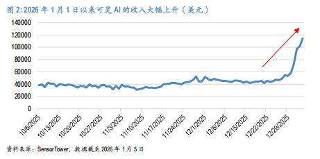 由于"寵物跳舞"視頻在新年引爆海外市場,可靈AI收入暴增。根據Sensor Tower數據,2026年1月可靈AI的移動平臺日均收入相比2025年12月暴增102%,其中韓國市場收入更是激增13倍。
